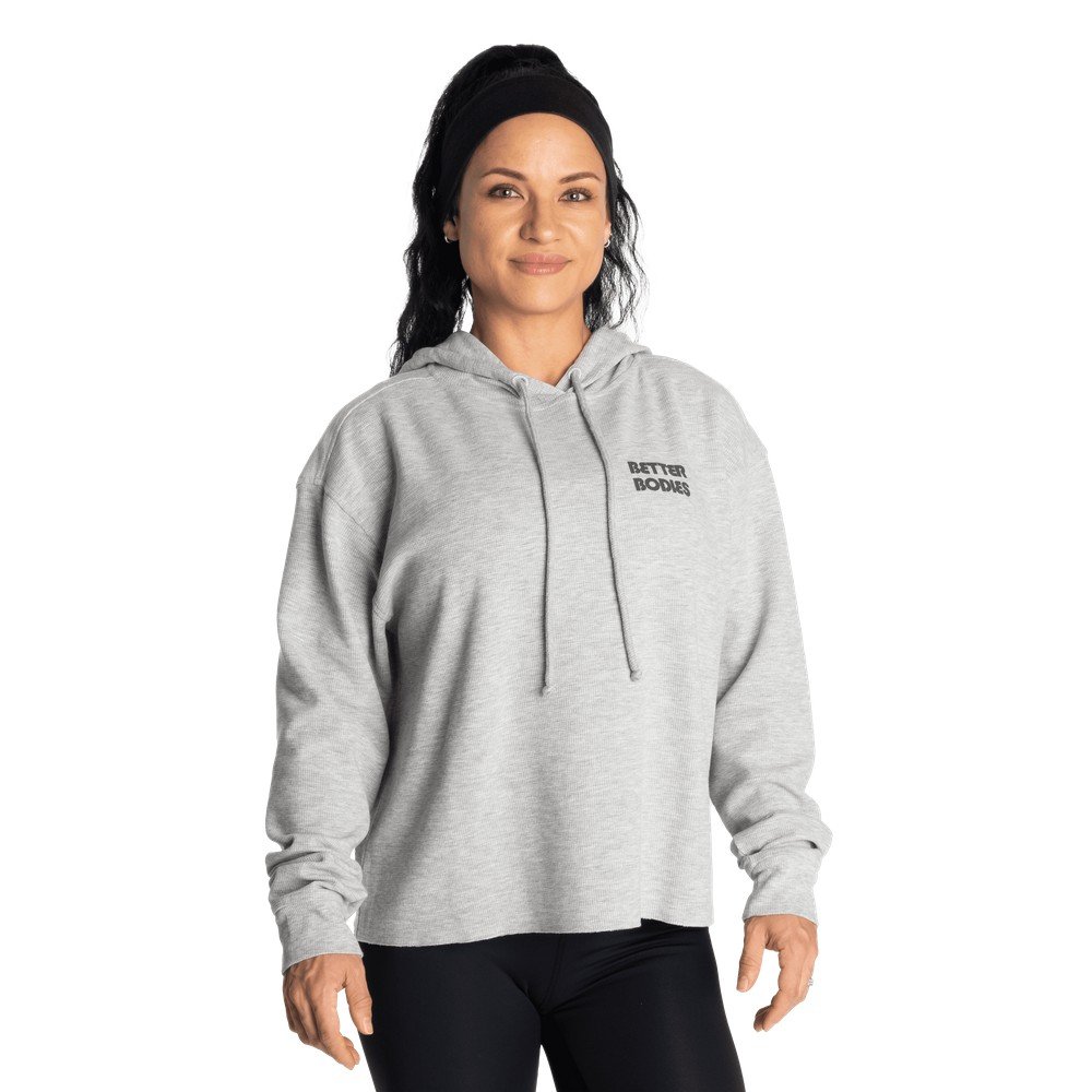 De Empowered Thermal Sweater van Better Bodies is een cropped loose fit hoodie voor de dames. Deze hoodie is gemaakt van onze zachte en ademende thermische stof en is extreem comfortabel en kan zowel als cover-up in de sportschool of als trui over je favoriete tanktop worden gedragen als je een extra laag nodig hebt. De stof, de onafgewerkte zoom en het grote old school-logo op de achterkant zorgen voor een rauw gevoel. Sinds het allereerste begin in 1982 draait het bij Better Bodies om empowerment en inclusiviteit, waardoor de sportschool ook een plek is waar vrouwen welkom zijn. Deze hoodie met het old school dumbbell-logo op de achterkant is een representatie van dat alles en een herinnering om echt oordeelvrij te leven.